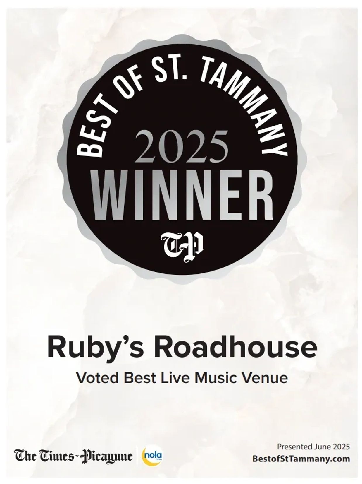 Thank you to The Times-Picayune | The New Orleans Advocate | The Best of St. Tammany for publishing Ruby's as the Silver Best Live Music Venue in St Tammany. Congratulations to all of the winners and most of all a tremendous thank you to all of the Ruby's family for keeping the music alive @ the House of Live Music - Ruby's Roadhouse!